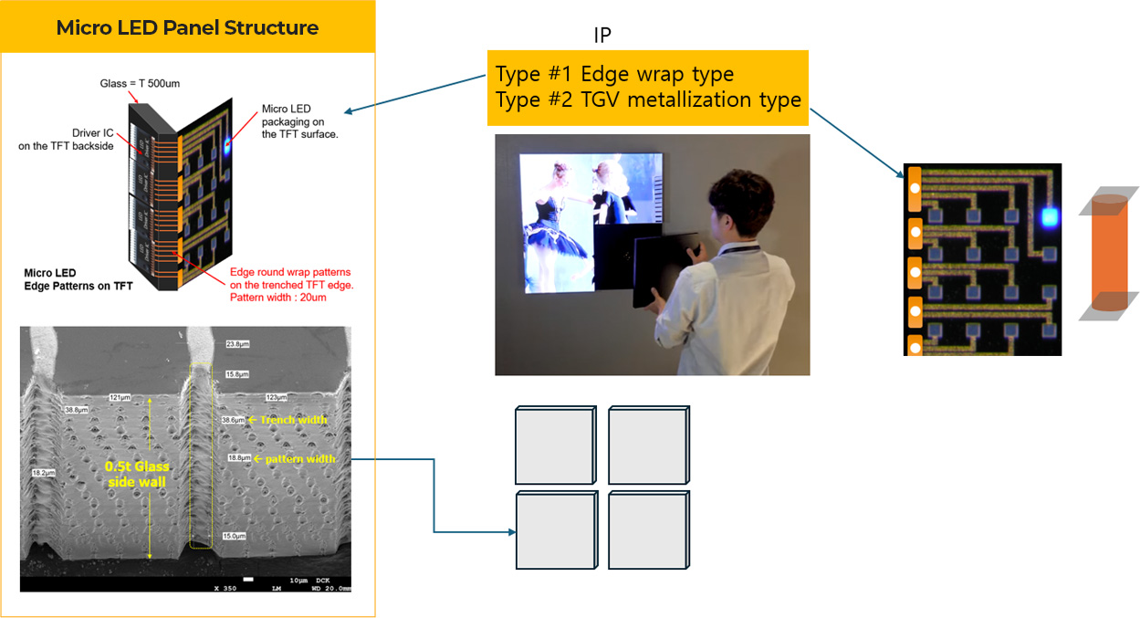 Nanotronix has developed a embedded side wrap patterning method for TFT composite structures(multi-metal layers patterns on glass) for micro LEDs, and has various experiences in glass surface patterning, such as transparent glass signage and CIS patterning on a pan-out type glass substrate base.